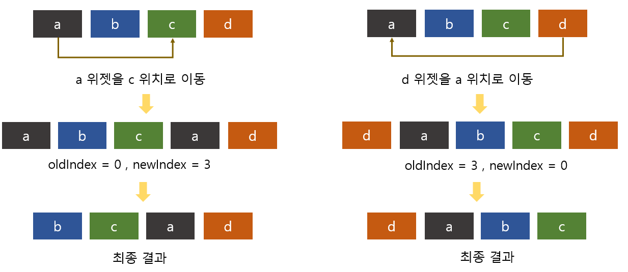 oldIndex > newIndex 인 경우(오른쪽) 최종 결과 d 위젯의 index 는 0 이고 newIndex 는 0 이다.