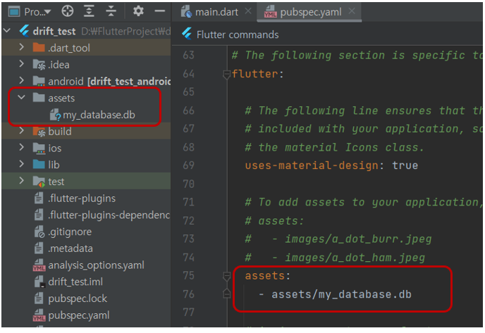 첫 번째로, assets 디렉터리에 데이터 베이스 파일을 넣고 pubspec.yaml 에 데이터 베이스 파일을 추가한다.