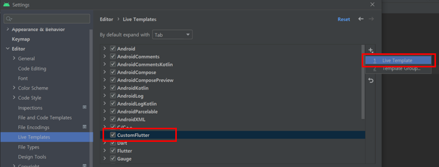 ① 먼저 File > Settings > Editor > Live Templates 탭에 들어간다.