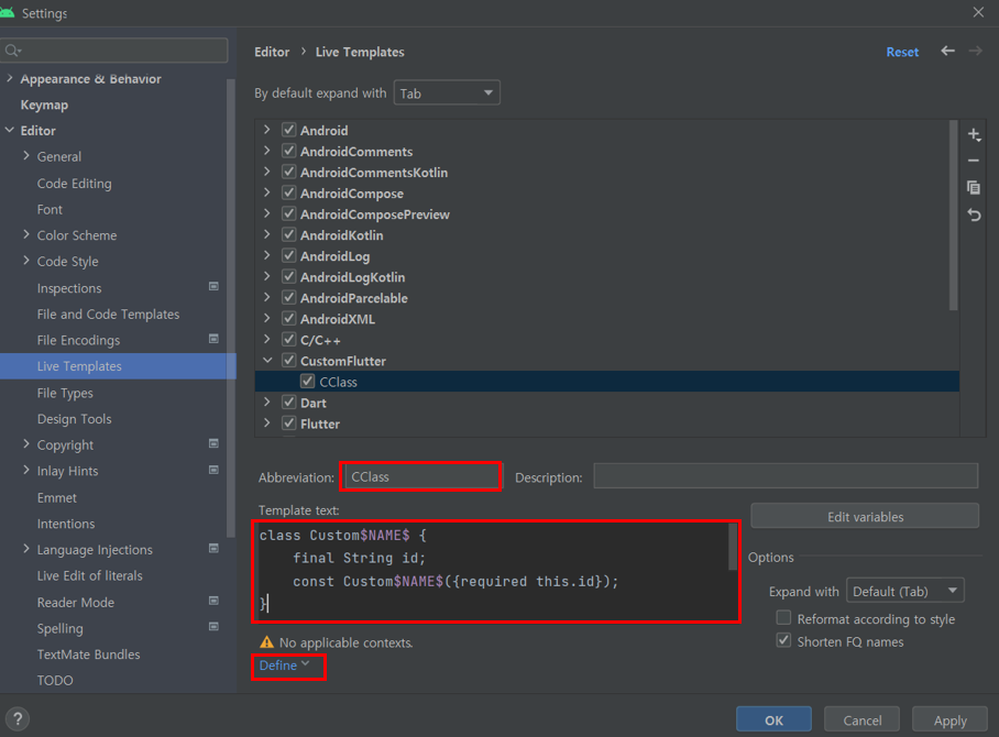 ④ 원하는 형식으로 Templates 를 정의한다. Abbreviation 으로 자동완성 단어를 넣고 Template text 에 내용을 입력해 준다. $NAME$ 는 사용자한테 직접 입력받을 수 있다. Define 을 클릭해 사용할 언어를 선택해 주고 OK 를 누른다.