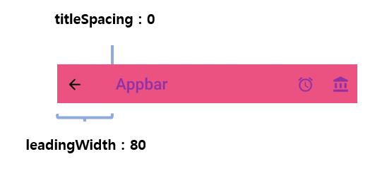 leading 과 title, actions 인자로 설명했던 대로 각 위젯을 배치하고 leadingWidth 로 leading 위젯의 크기를 설정했다. titleSpacing 값은 leading 위젯이 차지하는 공간과 title 위젯의 horizontal 간격을 의미한다. centerTitle 을 true 로 하면 title로 설정된 위젯이 leading 과 actions 사이의 가운데로 위치한다.