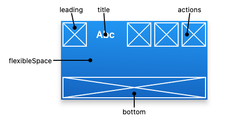 A Material Design app bar. An app bar consists of a toolbar and potentially other widgets, such as a TabBar and a FlexibleSpaceBar. App bars typically expose one or more common actions with IconButtons which are optionally followed by a PopupMenuButton for