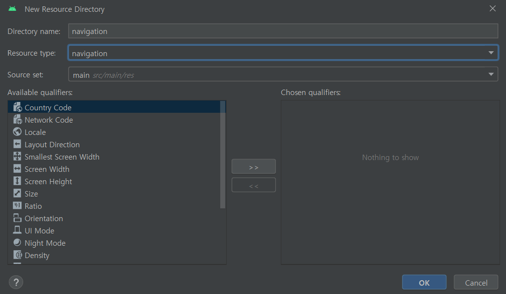 res/ 파일에 오른쪽 마우스 클릭 후 New > Android Resource Directory 생성 후 Resource type 을 navigation 으로 하고 이름을 Directory Name 을 navigation 인 디렉터리를 생성한다.