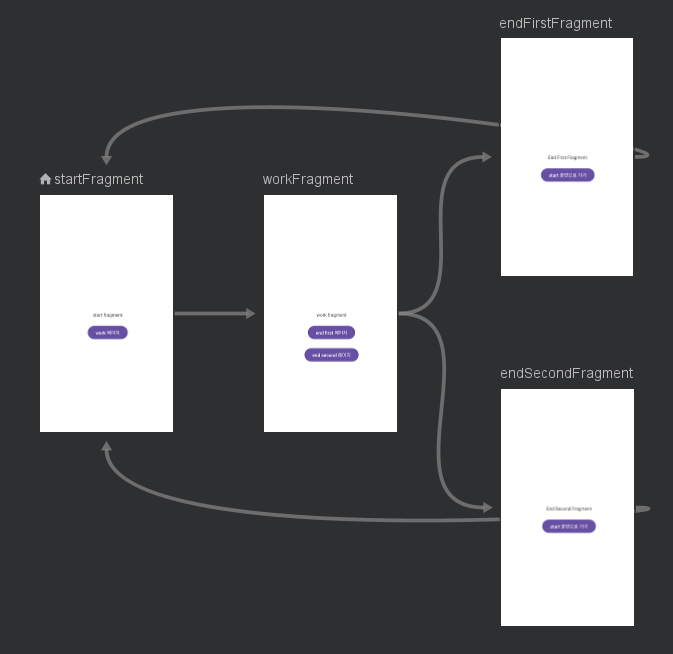 기본 탐색의 과정은 StartFragment > workFragment > EndFirstFragment , EndSecondFragment > StartFragment 이다.