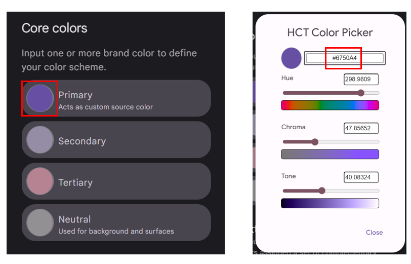 Material 테마 빌더로 이동하면 핵심 색상들이 보이는데 색상을 클릭하면 직접 수정할 수 있다. 주 색상(Primary)을 수정하면 주 색상에 맞게 Secondary, Tertiary, Neutral 색상도 변경된다.