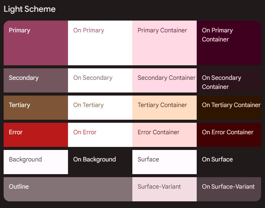 Material 테마 빌더의 색상 구성표와 같은 색상 스키마를 제공한다. Color.kt 파일에 색상 구성표에 따라 색상 변수를 미리 저장한 뒤,
